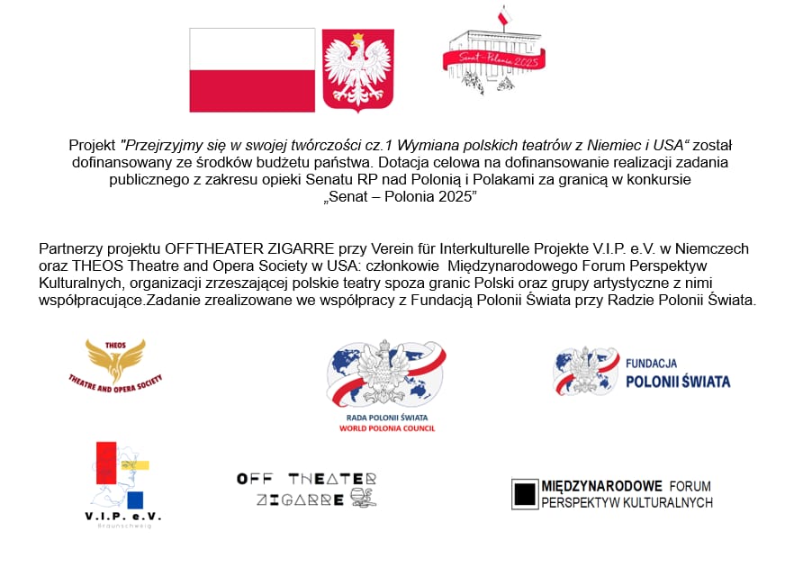 Projekt „Przejrzyjmy się w swojej twórczości cz. 1 Wymiana polskich teatrów z Niemiec i USA” został sfinansowany przez Senat RP w ramach opieki nad Polonią i Polakami za granicą w konkursie „Senat – Polonia 2025”. Prowadzony wspólnie z Fundacją Polonii Świata przy Radzie Polonii Świata – World Polonia Council. Wspólnie z Zosią i dzięki Zosi jesteśmy również członkiniami Międzynarodowego Forum Perspektyw Kulturalnych.