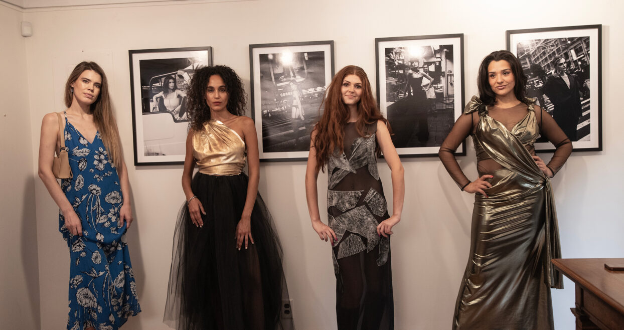 Modelki/Aktorki z Metropolis Artists Agency z projektami kreacji Patrycji Plesiak, w których wystąpiły. Od lewej: Christine James Walker, Giordana Pieri, Sarah Federman, Ramona Gantz oraz Mariusz Bargielski, kurator wystawy, w środku